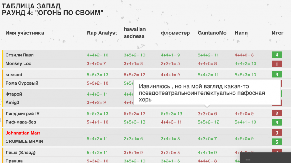 Поссал тебе в ротешник, большинство "раскрытий" одним притянутым за яйца предложением нахуй никому не нужны, шаблон треков из двух частей "раскрытие+дисс" тоже всех заебал и уже дурной вкус)) Так что за честность Джиллу респект, ну и вспомнил, как Джилл слетел с Пятого Официального во втором раунде с охуительным сторителлингом (в теме прямо было написано Сторителлинг «Должен остаться только один».) Если ты игноришь построение текста, рифмы и панчи в оценке за текст, а оцениваешь только "раскрытие" - то ты долбоёб. Если раскрытия нет, то ты должен скидывать один-два балла и идти нахуй, раскрывальщик. Если необходим сторителлинг, то это должно быть прописано. Если трек не относится к теме - то участник должен быть дисквалифицирован, это ты будешь решать, хуесос фломастер?) После создания прецедента дисквалифицировать можно будет многих.)