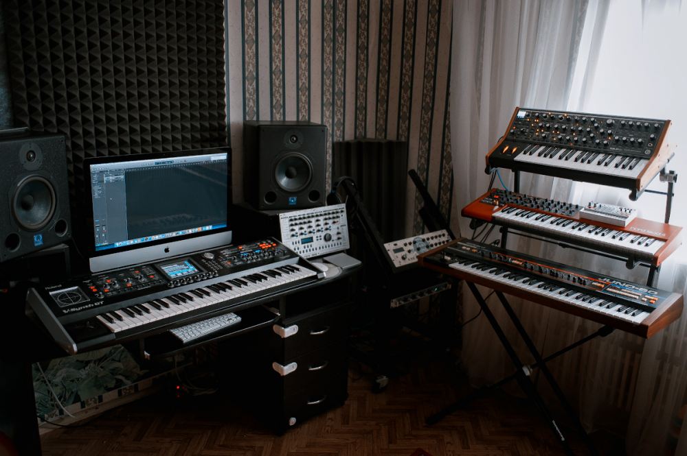 На стоечке 3-этажной свежачок, снизу вверх Roland Juno 60, Nord Lead 4, Moog Sub 37 ну и пиндюрка Korg Volca Sample которую мне дали тупо в нагрузку к норд лиду бесплатно ))  как то подозрительно стерильно. проводов не висит канатами