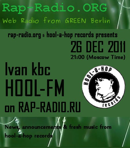 обязательно! Добавлено через 5 дней 6 часов 45 минут Rap-Radio.org и hool-a-hop records представляют:27 декабря 2011, 21:00 (по московскому времени) HOOL-FM Новости лэйбла, анонсы, свежая музыка! https://www.hip-hop.ru/forum/img/2011/12/25/67114ef7146e480d2.jpg заходим на сайт rap-radio.ru, скачиваем Live Stream для Вашего плеера и наслаждаемся Добавлено через 5 дней 8 часов 18 минут https://www.hip-hop.ru/forum/img/2011/12/25/67114ef72a66257c9.jpgДобавлено через 5 дней 8 часов 29 минут 27е число! |
