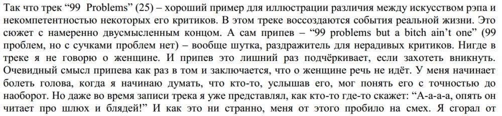 Местами перевод очень неправильный, и такое ощущение, что он специально сделан неправильно, но непонятно для чего. Вот к примеру самое простое, строчка "I got 99 problems but a bitch ain't one", почему-то она переведена как "99 проблем, но с сучками проблем нет", почему так я не понял, ведь в оригинале четко сказано "99 проблем, но сучки не одна из них".
