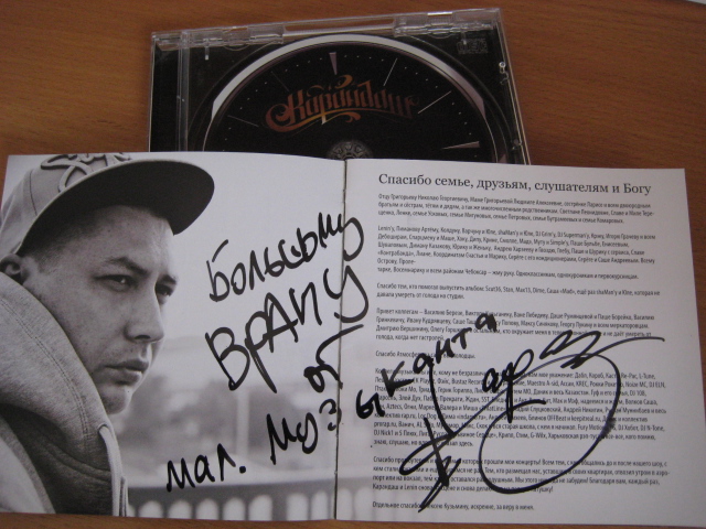 Вот из последнего, спасибо Ваничу, хотя дисков с автографами у меня мало, штук 6 всего.  У меня только Смоки МО весь, весь Карандаш, весь Слим и Птаха, весь Центр подрписаный Слимом и Птахой, весь Ник Ван, все диски от Анта и Бледного (кроме Ртути), Вульгартный Тонн - отвертка подписаная Кором, Рэпом, Класиком, Ксандрой, Понкой и Адиком, часть альбомов подписаная Винтом, альбом ТОнн Павлова