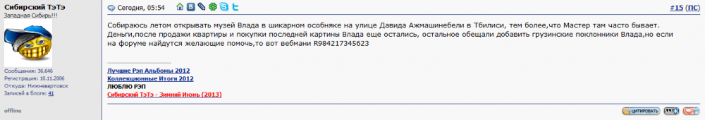 | Самое дерьмо знаете в чем? Если Влада запишет пиздец альбом, с пиздатым битом, и сибко окажется правым, хотя врятли я доживу до этого. | | | | | | в Бане