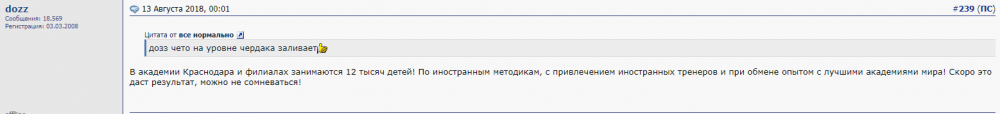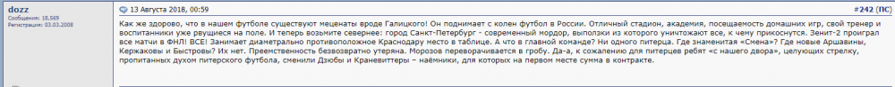 Ну а в Урале президент клуба сидит на скамейке и чуть ли не управляет командой во время игры,и что?Тренеры в Урале всегда были разные и независимые:Гончаренко,Парфенов,Скрипченко,Тархано в.Или в Баварии Бекенбауэр сидит на высоком кресле,но он не учит Хайкенс или Гвардиолу тренировать.Галицкому результат абсолютно не важен,он сам об этом неоднократно говорил,ему важен атакующий футбол и свои воспитанники.И то и то у него есть.Ему лучше контроль мяча 70% и победа 1-0,чем автобус у своей штрафной и 5-0 на контратаках.Я глубоко уважаю Сергея Николевича за принципиальность,вот болельщикам Спартака,например,глубоко насрать на стеночки и забегания,им важен результат.Константин Иванович Бесков и братья Старостины переворачиваются в гробу,наверное,когда видят чемпионство Карреры на контратаках. | Я не проверял, но в студии МАТЧ ТВ сказали, что у Краснодара самый маленький процент владения мячом среди всех (!) команд Лиги Чемпионов. И что, это называется атакующий футбол? Да и играет Краснодар примерно так же, как и другие представители РПЛ: оборона-контратака, я не вижу разницы. Я думаю, что даже Галицкий уже понимает, что академия, насколько многочисленной она бы не была, не может удовлетворить потребность основной команды в кадрах, поэтому Краснодар добирает Чернова, Смольникова, Ионова и пр. «Атакующий футбол» это ширма, которой прикрывается отсутствие гибкости, глубокого анализа и подхода к сопернику. Чтобы все это было, команде нужен настоящий тренер, а не картонный. Добавлено через 2 минуты 39 секунд Цитата: