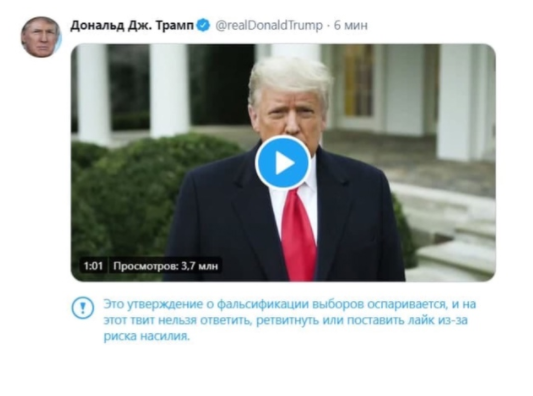 Типо на выборах Трампа на прошлых было куча разных твитов, которые повлияли на результаты выборов, поэтому на время новых выборов где победил Байден во первых Твиттер отключил возможность ретвитить без комментария, а во вторых вот такие пометки стал делать как Трампу.