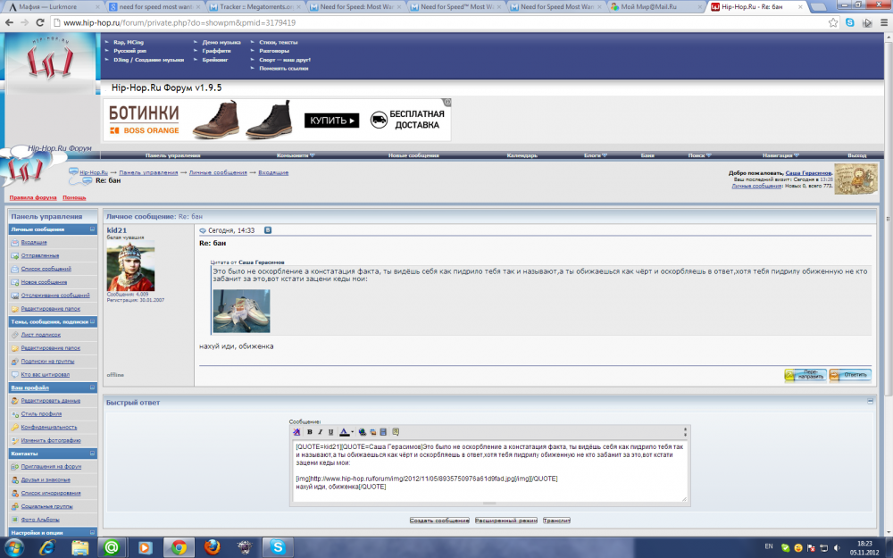 это кид что ли забанил его тогда? наверно,твой вирт его хуисосом назвал и попал в бан на пмж и потом он на моей стене обозвал твоего вирта хуесосом  он обозвал 26 октября, забанили 3 ноября, да и вроде реперих страницу осящал насколько помню в тот день. здесь вроде нет за отщепенцем грешка  | | | | | |